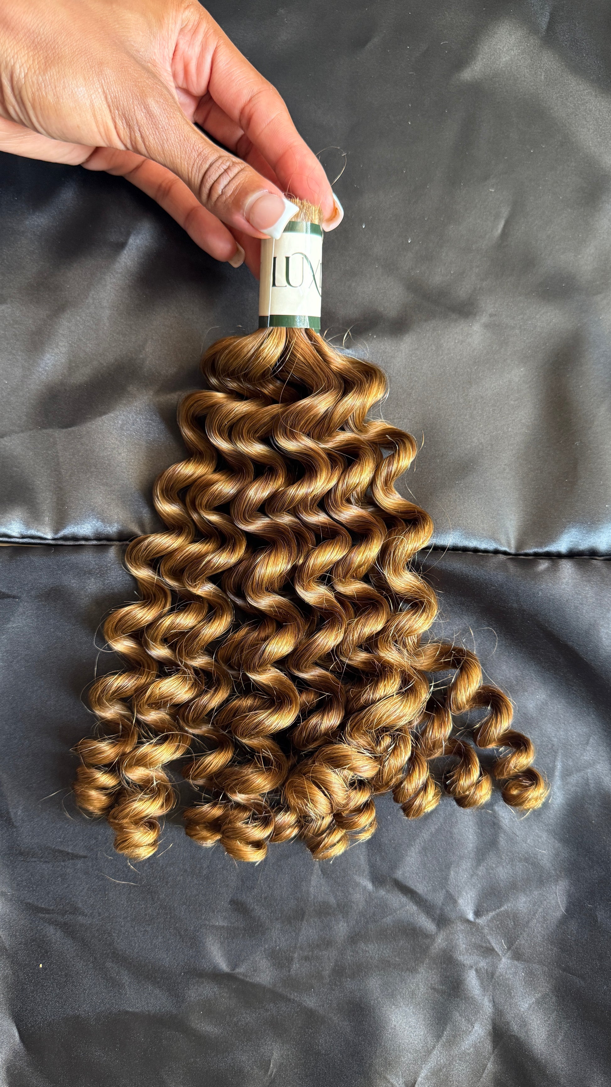 Indulge in effortless luxury with our Honey Deep Wave - a radiant golden sun-kissed extension that blends rich amber and auburn brown lowlights. Honey blends is perfect for every season whether your on vacation, a special event or you want to achieve a perfect match to your natural hair color. Honey can be paired with colors #27, #30 and/or #4.
